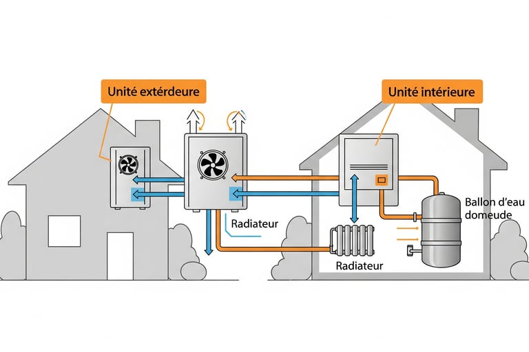 Chauffage et eau chaude : La PAC air-eau produit à la fois le chauffage pour votre maison et l'eau chaude sanitaire, pour un confort total.